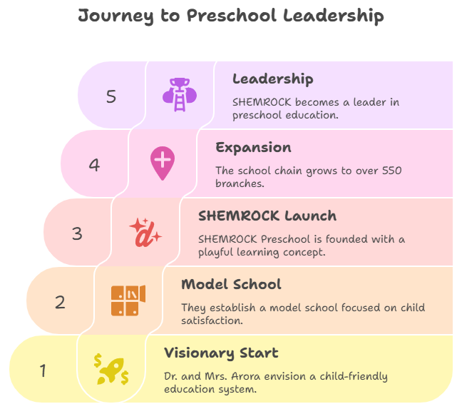 SHEMROCK is one of India’s 1st Playschool Chains, which is credited with revolutionising the concept of early childhood education since 1989, by pioneering a vibrant and child-friendly system of learning. Today, with more than 4,00,000 children already having received the foundation for success from its 550+ branches, SHEMROCK, the Award Winning School Chain, is a leader in preschool education and is a brand to reckon with. SHEMROCK is promoted by the Arora family – which consists of two generations of the country’s leading educationists with over 100 years of combined experience in the field of education.