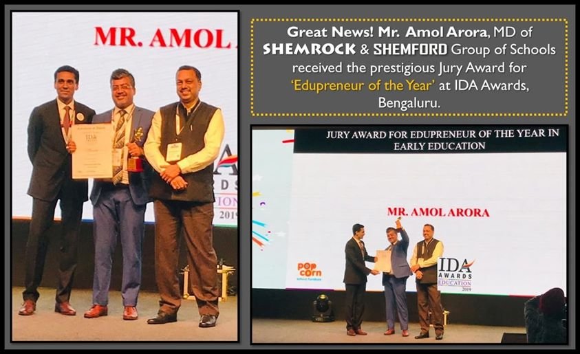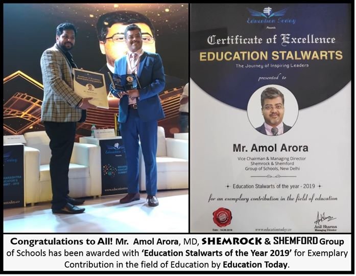 Mr. Amol Arora, MD, SHEMROCK & SHEMFORD Group of Schools has been awarded with ‘Education Stalwarts of the Year 2019’ for Exemplary Contribution in the field of Education at the Maharashtra Educator’s Summit, Mumbai by Education Today on 14th September 2019.