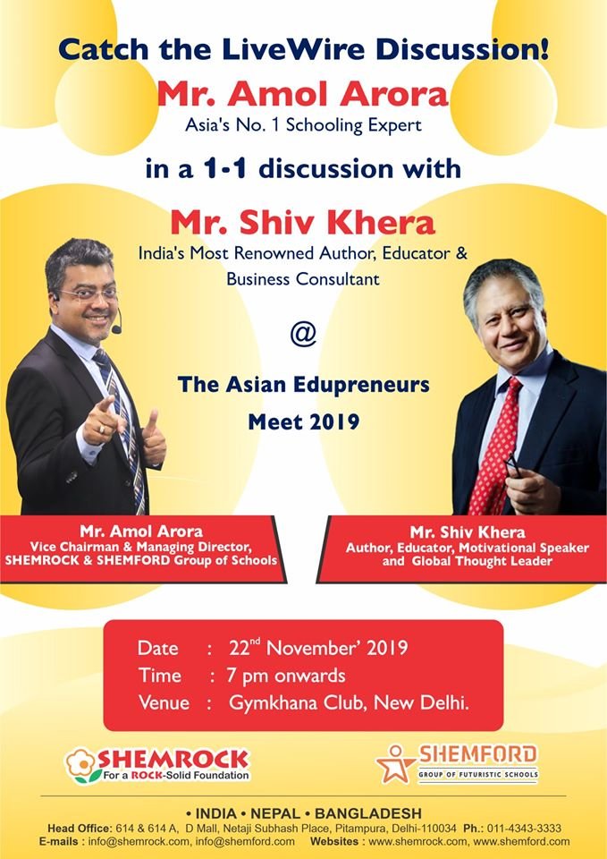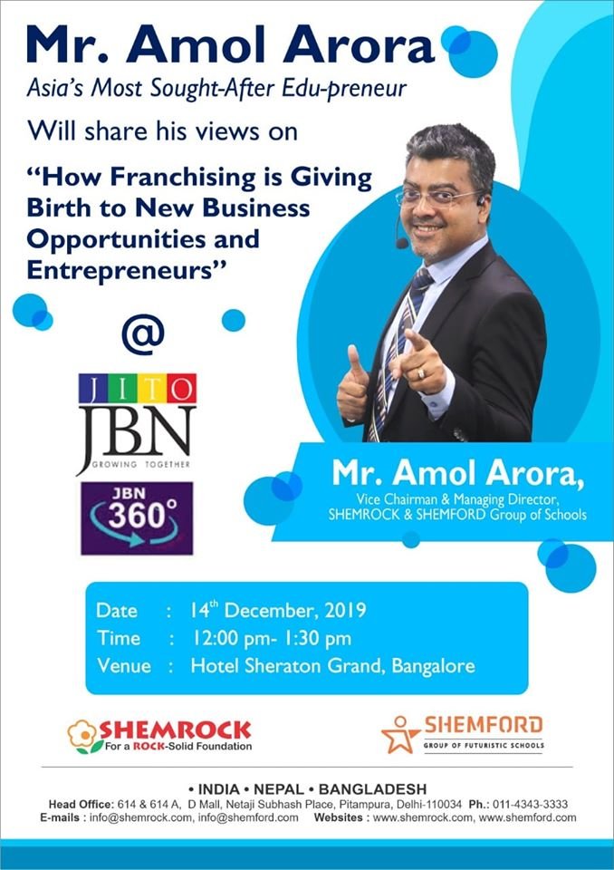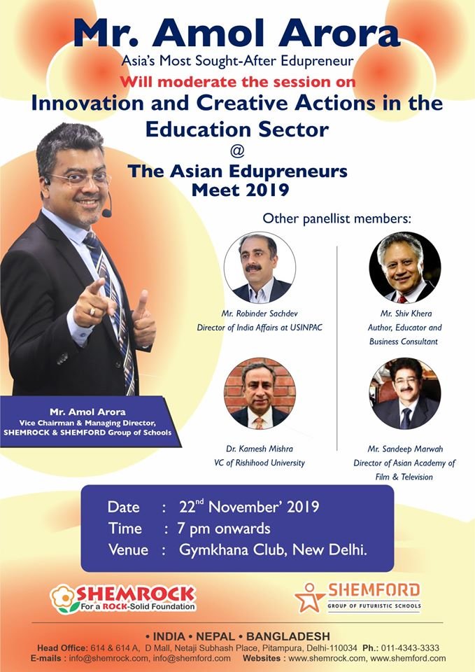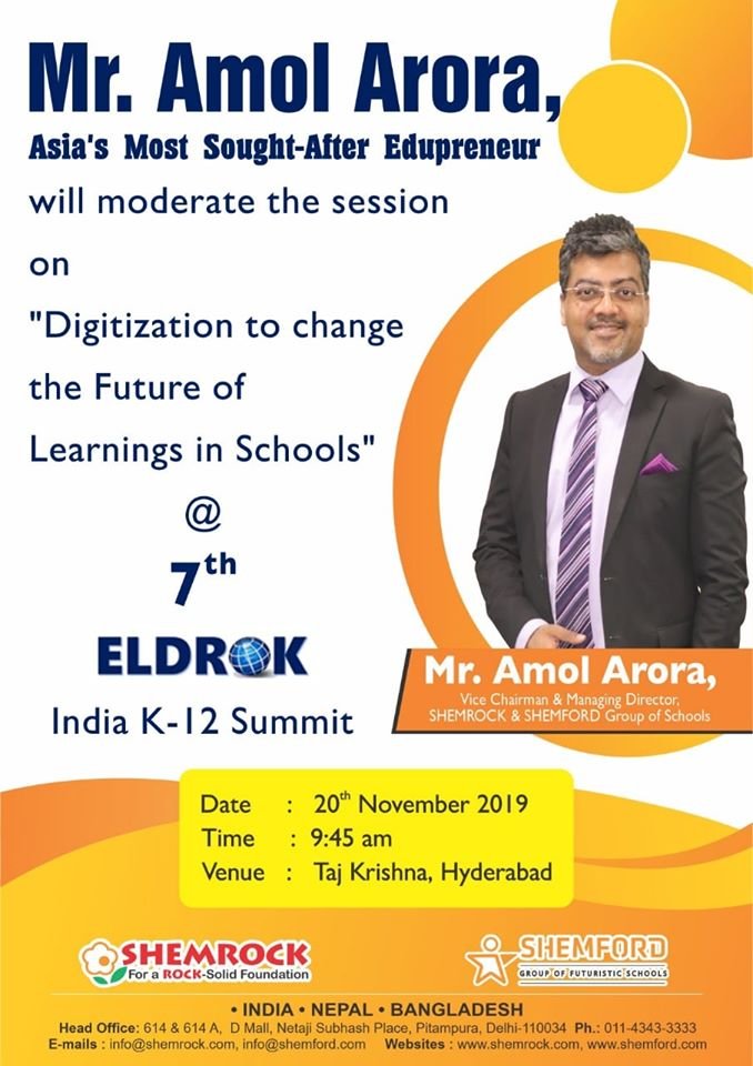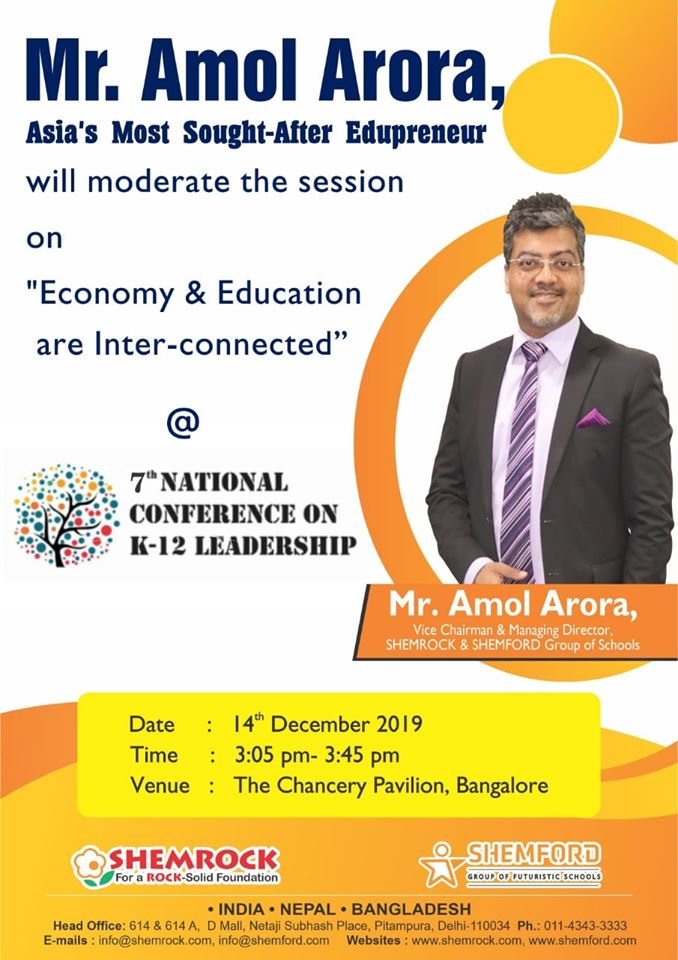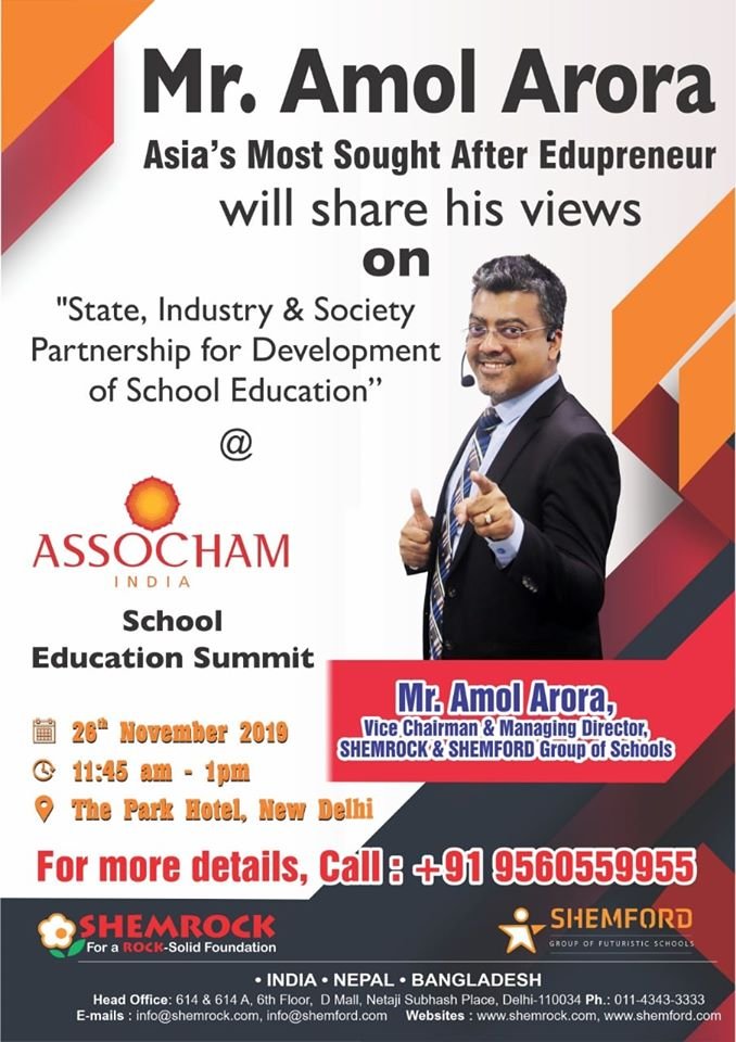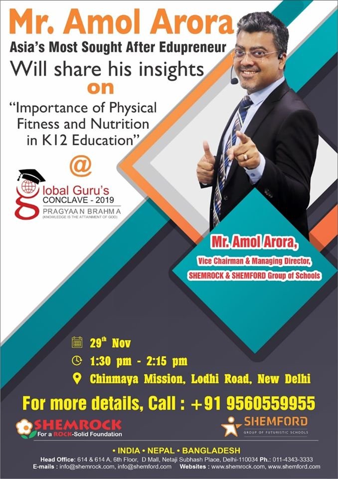 Mr. Amol Arora, MD of SHEMROCK & SHEMFORD Group of Schools, and an eminent Edu-preneur, will share his views on the “Importance of Physical Fitness and Nutrition in K12 Education” at the Global Guru’s Conclave on 29th Nov at Chinmaya Mission, Lodhi Road, New Delhi.